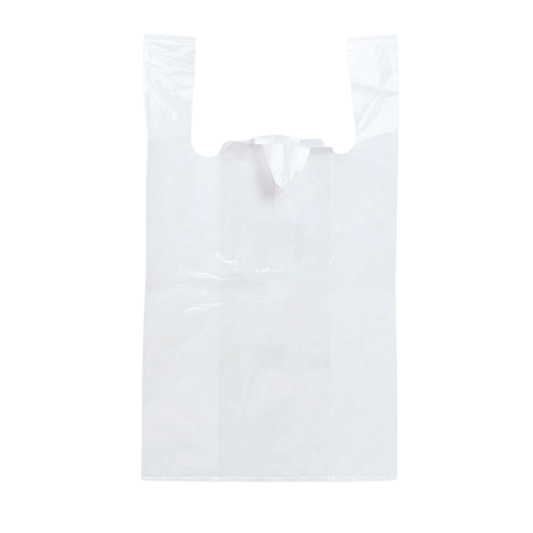 Bolsa camiseta blanca de polietileno resistente de alta densidada Ideal para el comercio, alimentos, frutas y verduras. Práctica, económica y fácil de transportar.